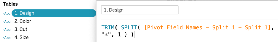 TRIM( SPLIT( [Pivot Field Names - Split 1], ")", 1 ) )
